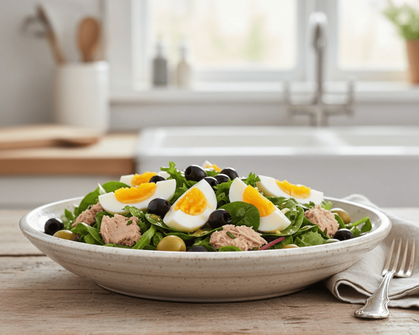 • Cách trình bày và thưởng thức: Salad cá ngừ ngâm dầu được bày trong tô hoặc đĩa rộng, trang trí với trứng luộc, ô liu và rau thơm, dùng lạnh.