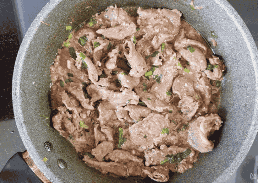 - Thêm thịt bò đã chín, rưới nước sốt, trộn đều tay.