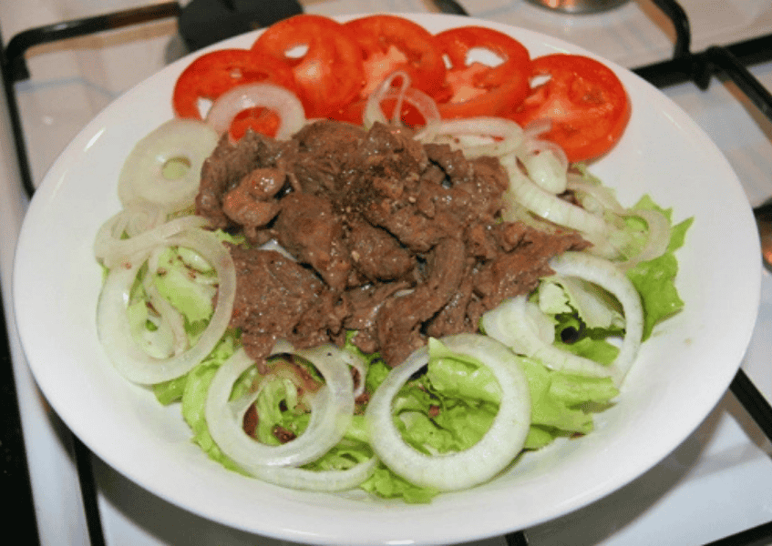 - Cách chế biến: Áp chảo thịt ba chỉ bò mềm, trộn với xà lách, cà chua, hành tây.