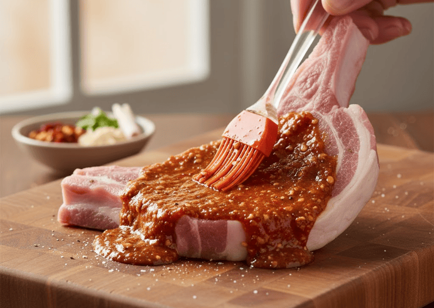 • Phết đều hỗn hợp sốt lên cả hai mặt của miếng sườn.