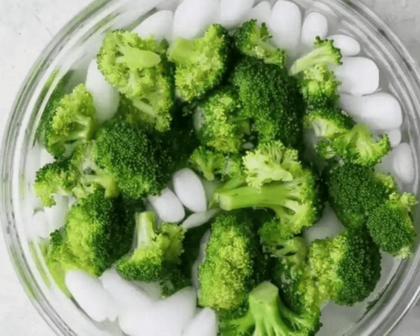 Chuẩn bị sẵn tô nước đá lạnh, vớt súp lơ vừa luộc ra ngâm ngay trong 1 phút.
