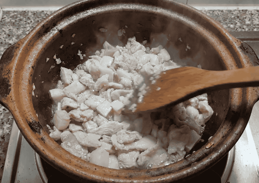Bắc nồi lên bếp, cho dầu vào và phi thơm hành tỏi. Cho thịt vào xào đến khi săn lại và dậy mùi thơm.