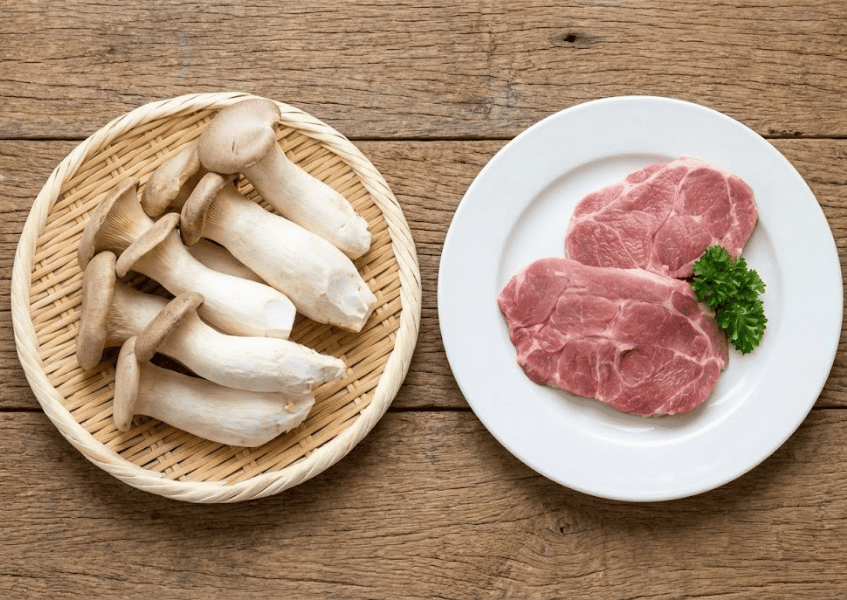 Rửa sạch nấm đùi gà, cắt lát dọc dày khoảng 0.5–1cm. Hành tây thái múi cau (nếu dùng). Thịt vai heo rửa sạch và thái mỏng vừa ăn.