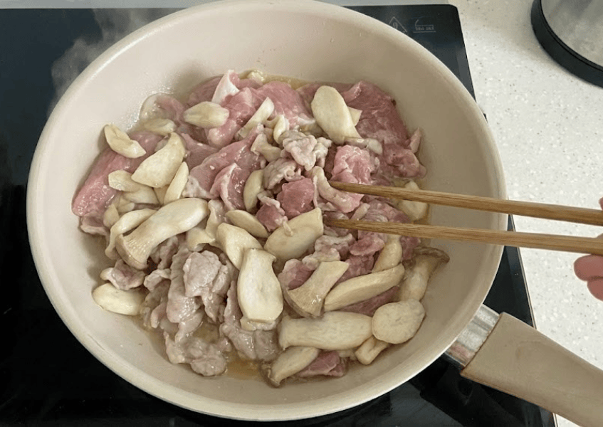 Cho nấm vào cùng thịt, đảo nhanh tay. Nếu thấy hơi khô, thêm khoảng 10–20ml nước để tạo độ ẩm giúp nấm chín đều mà không bị cháy.