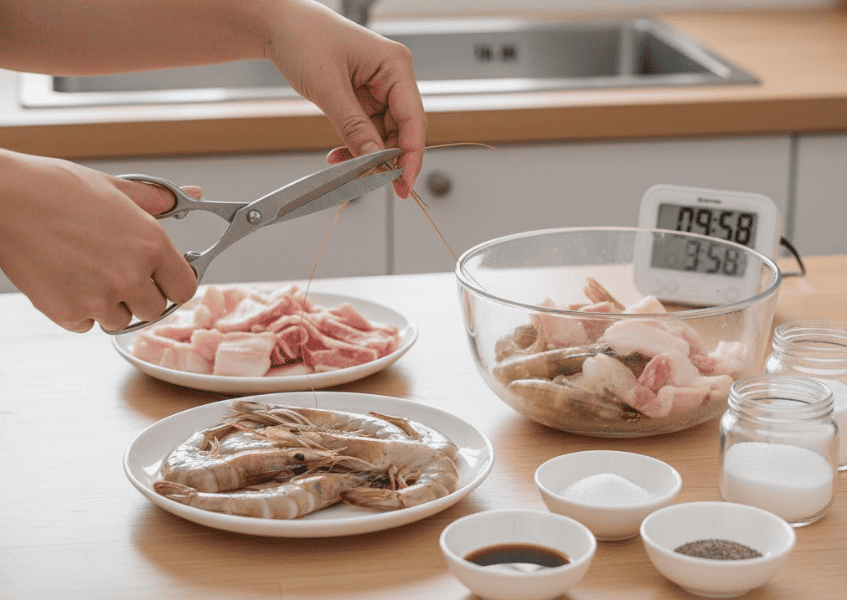 Rửa sạch tôm, cắt râu; thịt ba rọi rửa muối, cắt lát mỏng. Ướp chung với nước mắm, đường, hạt nêm trong 10 phút cho thấm vị.