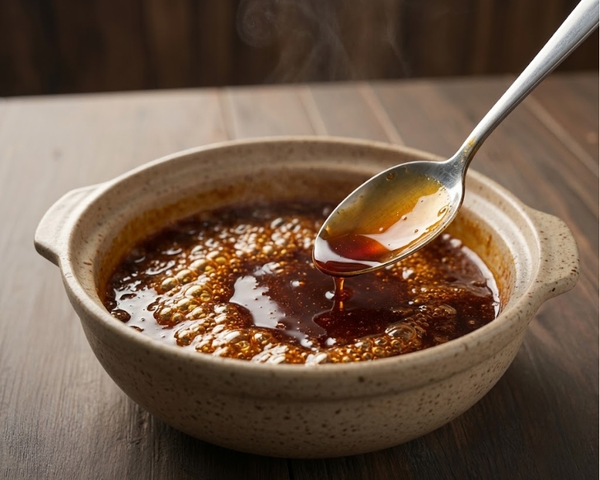 • Cho 1 muỗng canh đường còn lại và một ít nước lọc vào nồi (nên dùng nồi đất hoặc nồi dày). Đun lửa vừa, khuấy nhẹ cho đường tan.
