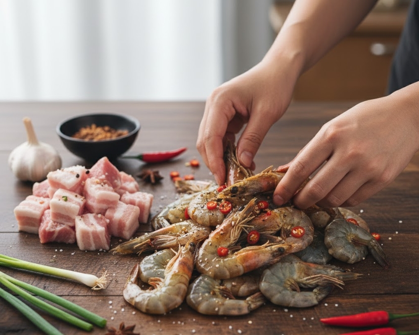 • Kho tôm: Cho tôm đã ướp và thịt ba chỉ vào nồi. Đảo đều với lửa lớn để tôm săn lại và chuyển sang màu đỏ.