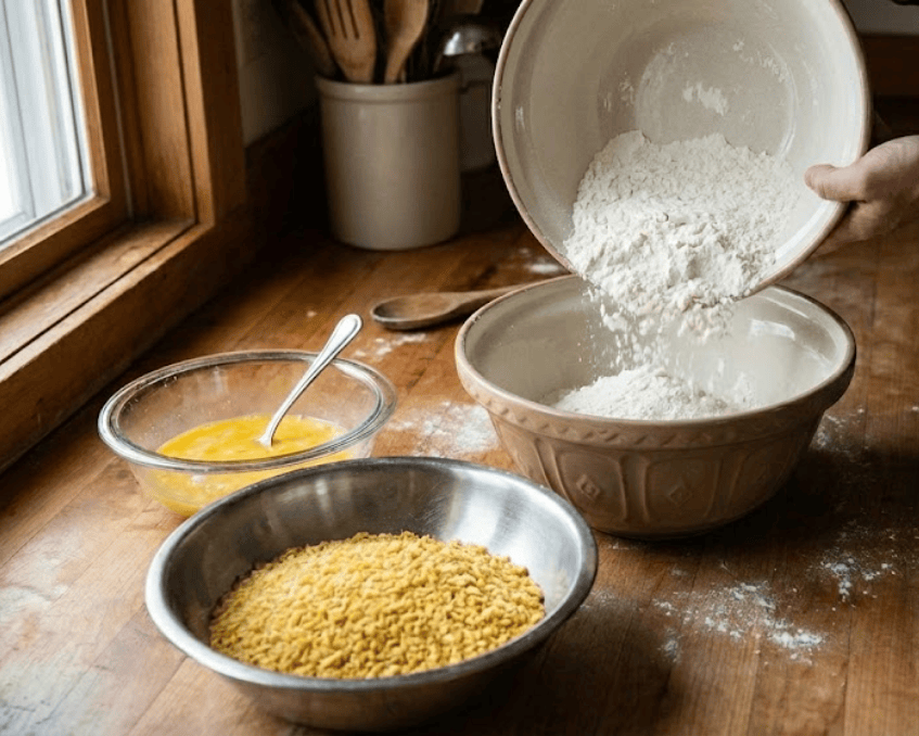 Bột chiên xù: Ưu tiên bột chiên xù hạt to, khô và tơi. Để tạo lớp áo giòn xốp, không bị chai cứng khi nguội.