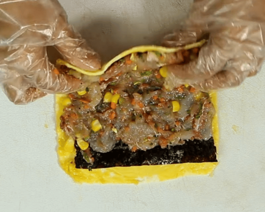 Trải miếng trứng ra mặt phẳng, cho phần nhân tôm vào giữa, cuộn tròn lại nhẹ tay. Nếu cần, có thể dùng hành lá chần buộc cố định để giữ dáng cuộn.