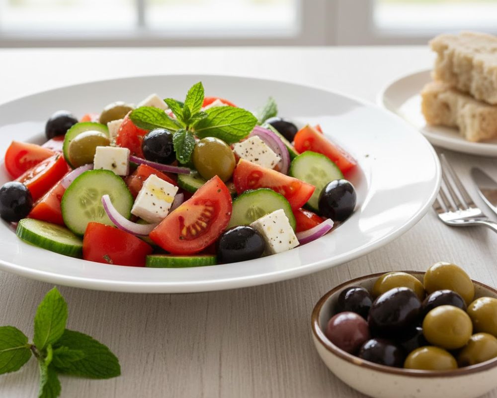 Bạn có thể thêm vài quả ô liu vào salad bơ, cà chua, xà lách. Món này dễ ăn, phù hợp cho bữa trưa nhẹ hoặc bữa tối lành mạnh.