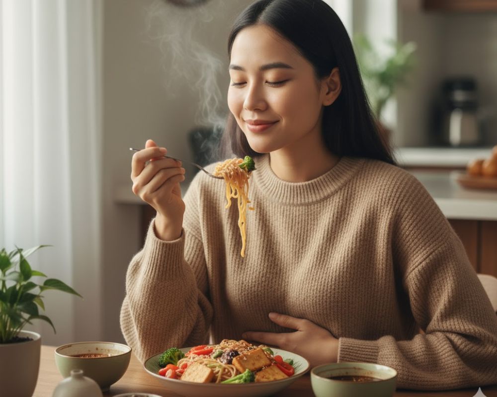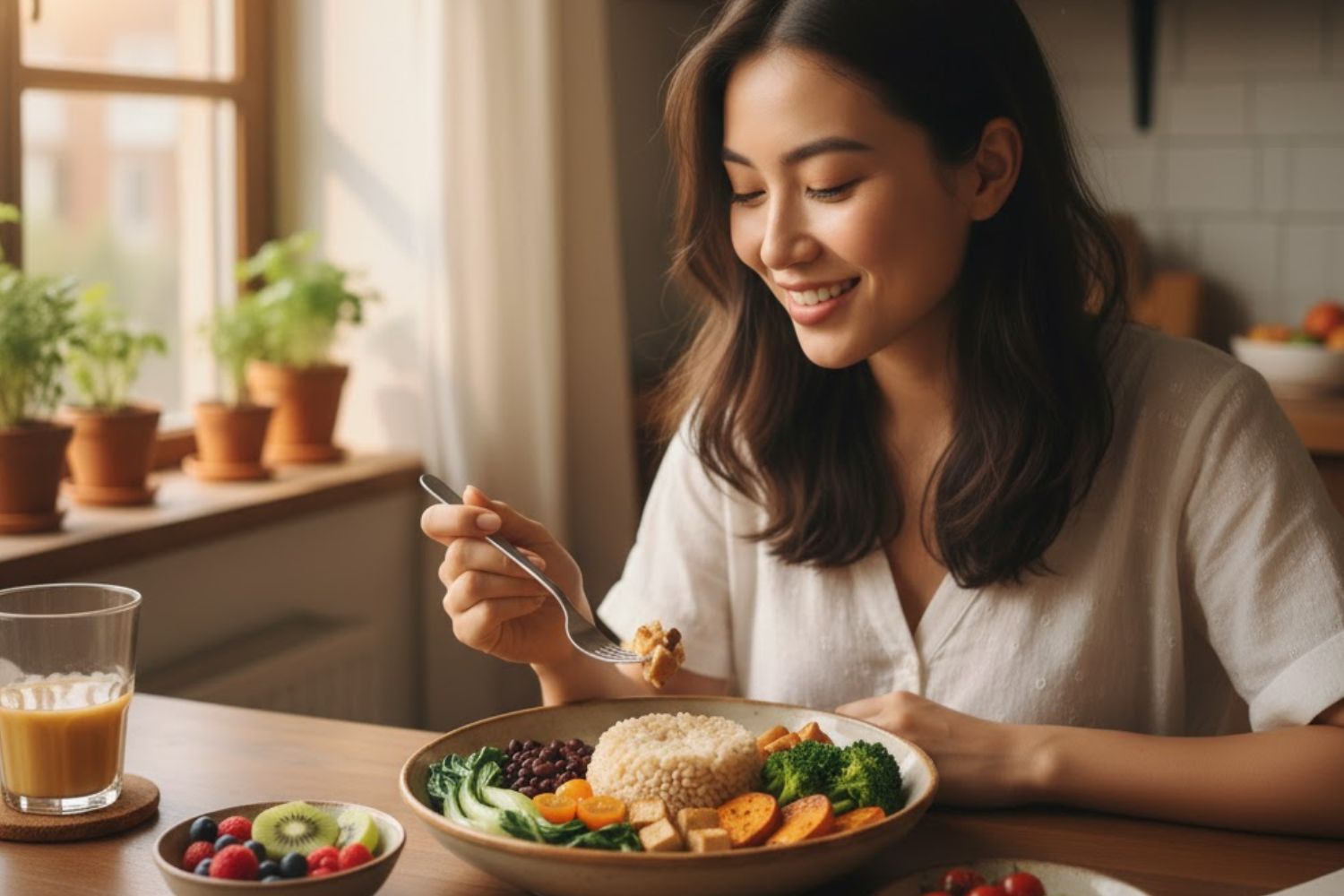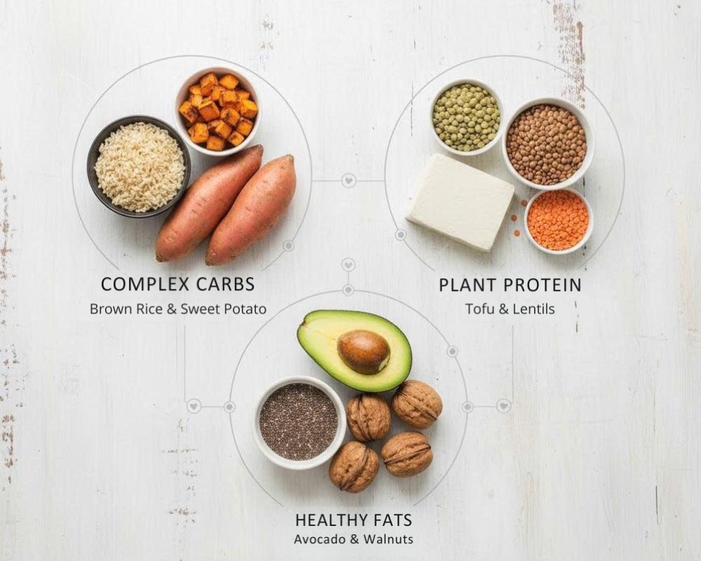 Ví dụ: Cơm gạo lứt + đậu hũ chiên giòn + rau cải xào tỏi + canh bí đỏ — bữa ăn đơn giản mà đủ năng lượng cho cả ngày.