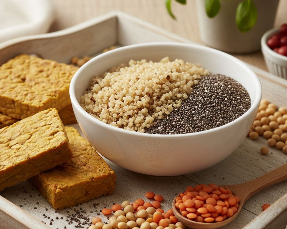 - Đạm thực vật: đậu hũ, tempeh, đậu nành, đậu lăng, hạt quinoa.