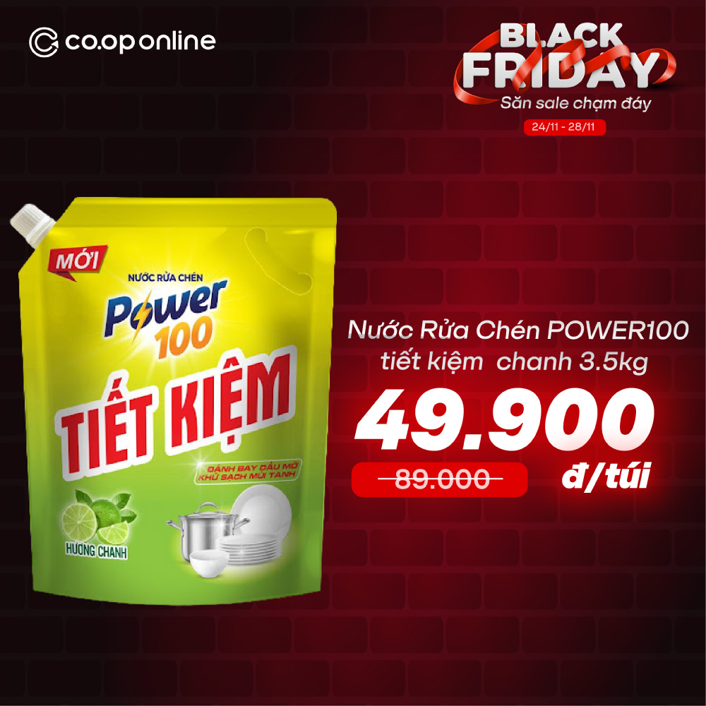• Nước Rửa Chén POWER100 tiết kiệm chanh túi 3.5kg, giảm 44%, chỉ còn 49.900 đ/chai (giá gốc 89.000đ/chai)