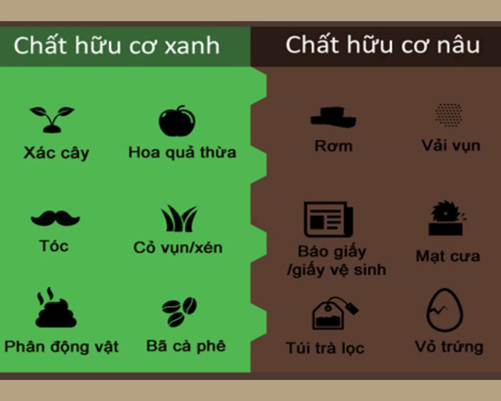 - Nhóm “nâu” (giàu carbon): lá khô, giấy không mực, mùn cưa, rơm rạ, vỏ trứng.