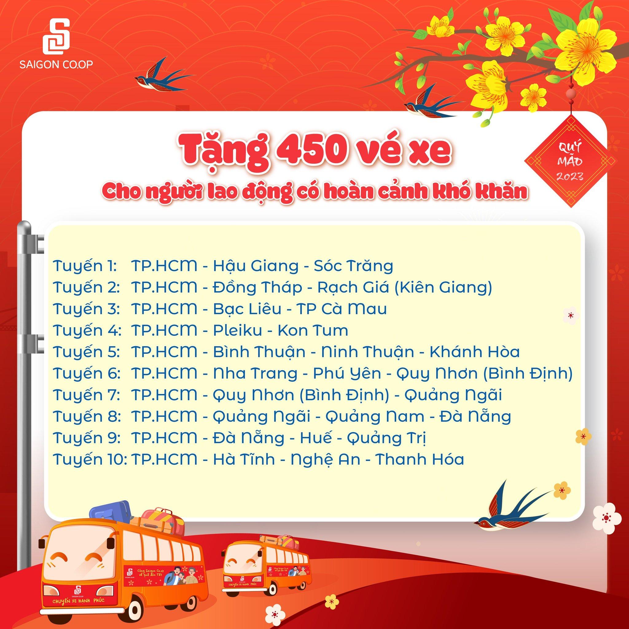 Để tạo điều kiện cho người lao động có hoàn cảnh khó khăn về quê dịp Tết Nguyên đán Quý Mão này, Saigon Co.op tổ chức chương trình Chuyến xe hạnh phúc, tặng vé xe 0đ về quê ăn Tết để mọi nhà đều có một cái Tết thiệt vui và trọn vẹn ?