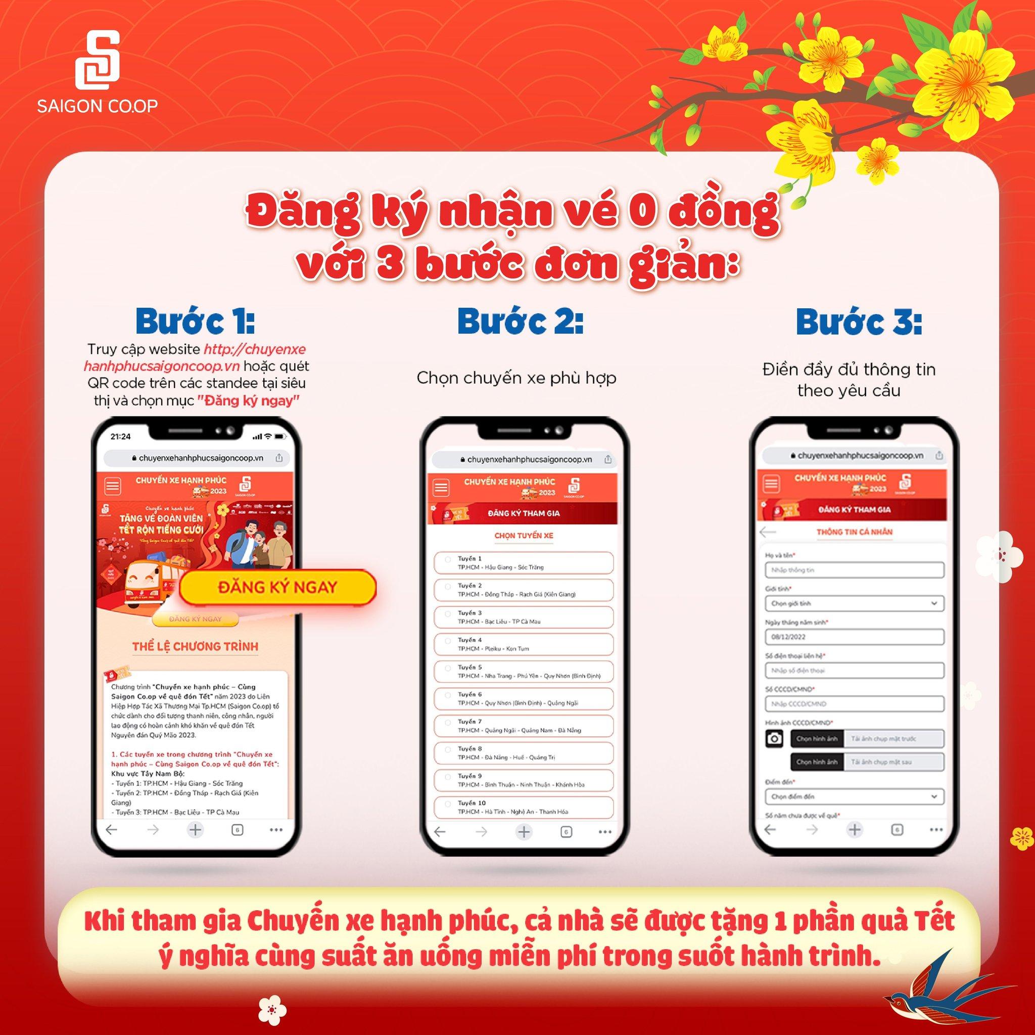 Cả nhà có thể bắt đầu đăng ký nhận vé từ ngày 10/12/2022 đến ngày 26/12/2022 trên trang thông tin chính thức của chương trình https://chuyenxehanhphucsaigoncoop.vn, nhà mình lưu ý mốc thời gian để tranh thủ đăng kí vé sớm nha!
