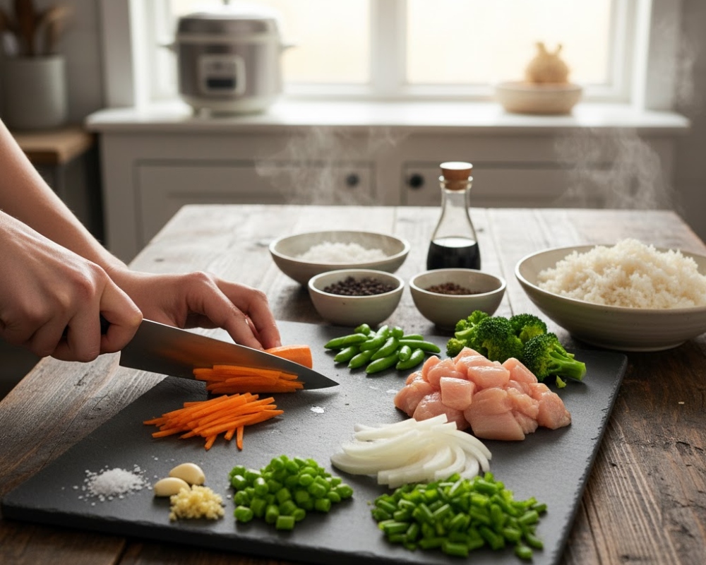 • Rau củ rửa sạch, cắt hạt lựu hoặc sợi mỏng để chín nhanh.