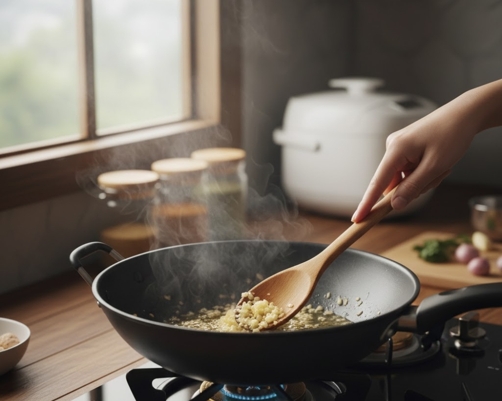 • Phi hành hoặc tỏi để tăng mùi thơm trước khi xào nguyên liệu chính.