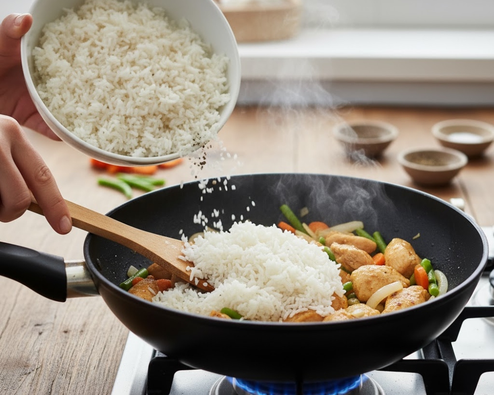 Thêm cơm nguội vào chảo để làm cơm lười tại nhà