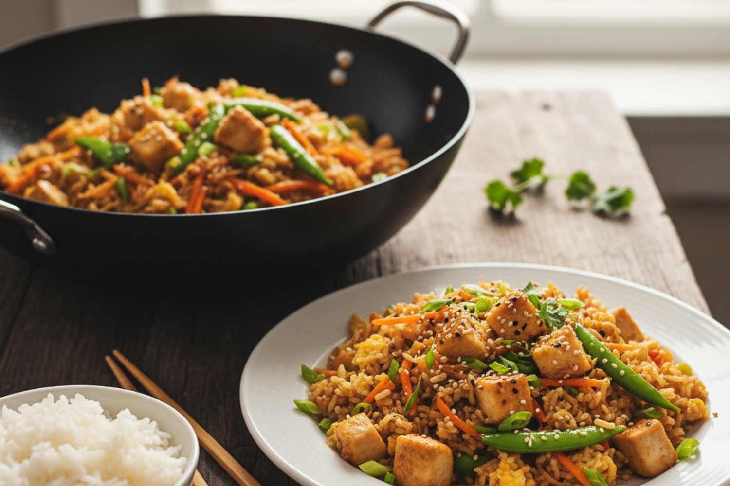 • Dọn cơm ra đĩa, trang trí thêm rau thơm hoặc hạt mè nếu thích.