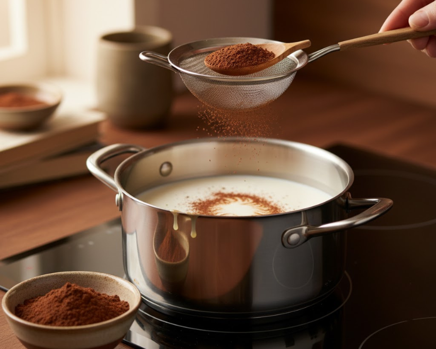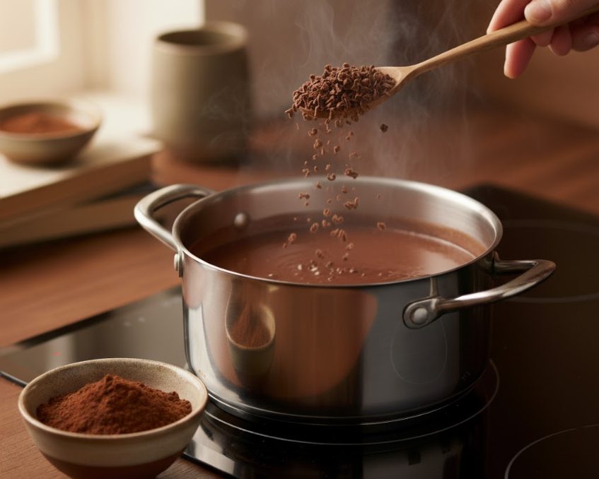 - Đun ở 80–85°C trong 5 phút cho đến khi sữa nóng và cacao tan hoàn toàn.
