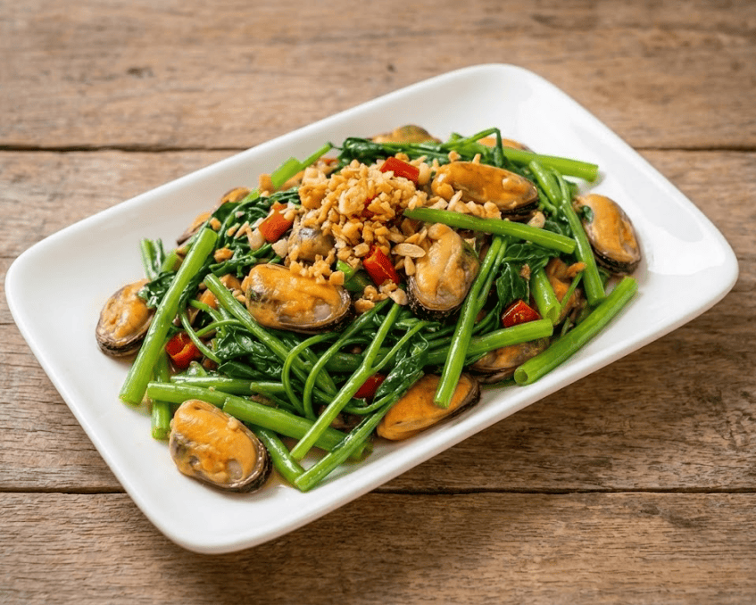 - Cách trình bày và thưởng thức: Đĩa rau muống xào xanh mướt, điểm xuyết những con vẹm căng mọng và đậu phộng vàng ươm.