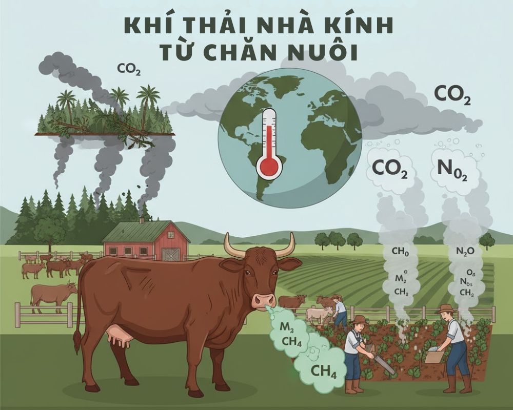 Ngành chăn nuôi chiếm tỷ lệ lớn trong phát thải metan – loại khí gây hiệu ứng nhà kính mạnh hơn CO₂ nhiều lần. Bên cạnh đó, việc nuôi bò, cừu và lợn đòi hỏi diện tích đất khổng lồ để trồng thức ăn và chăn thả. Điều này dẫn đến mất rừng, ô nhiễm nguồn nước và suy giảm đa dạng sinh học.