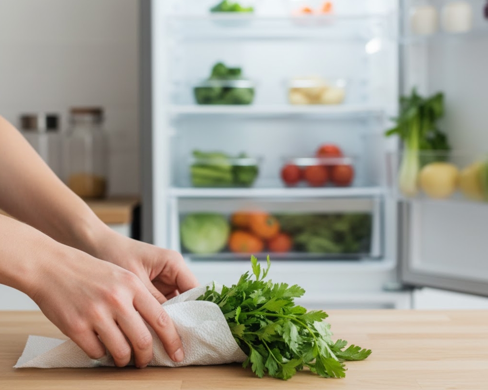 Độ ẩm dư thừa trong tủ lạnh là nguyên nhân khiến rau củ nhanh úng, mềm hoặc thối rữa. Giấy ăn giúp kiểm soát độ ẩm, giữ rau tươi giòn lâu hơn.