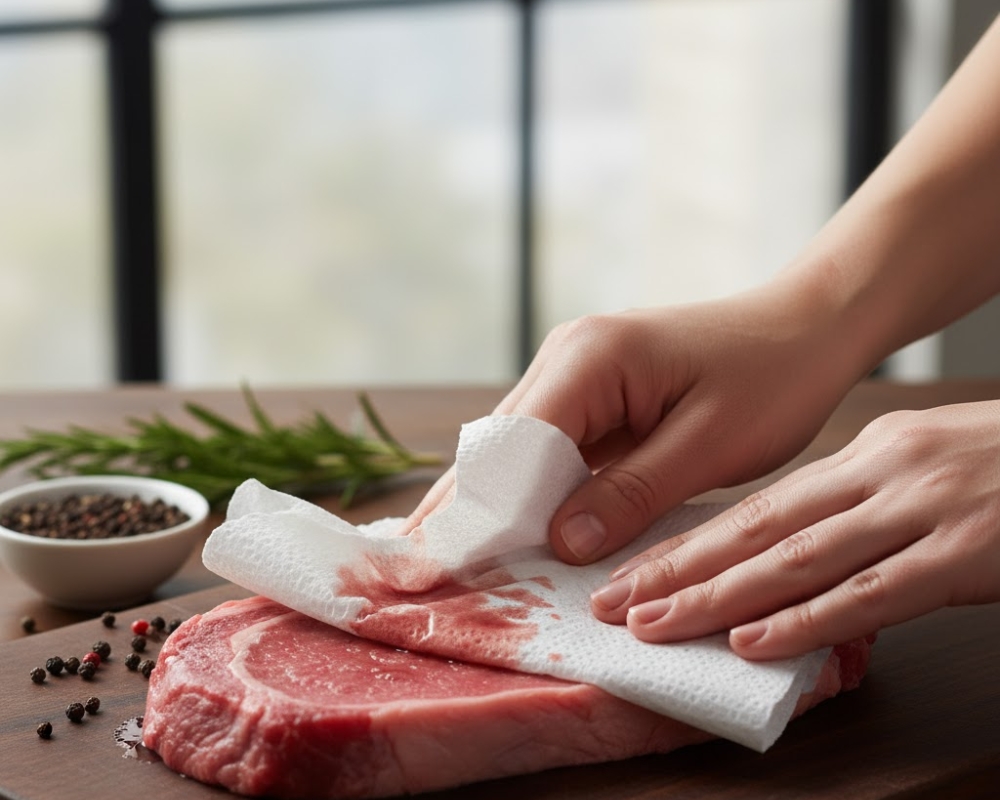 - Dùng giấy ăn thấm nhẹ toàn bộ bề mặt thịt cá trước khi nấu.