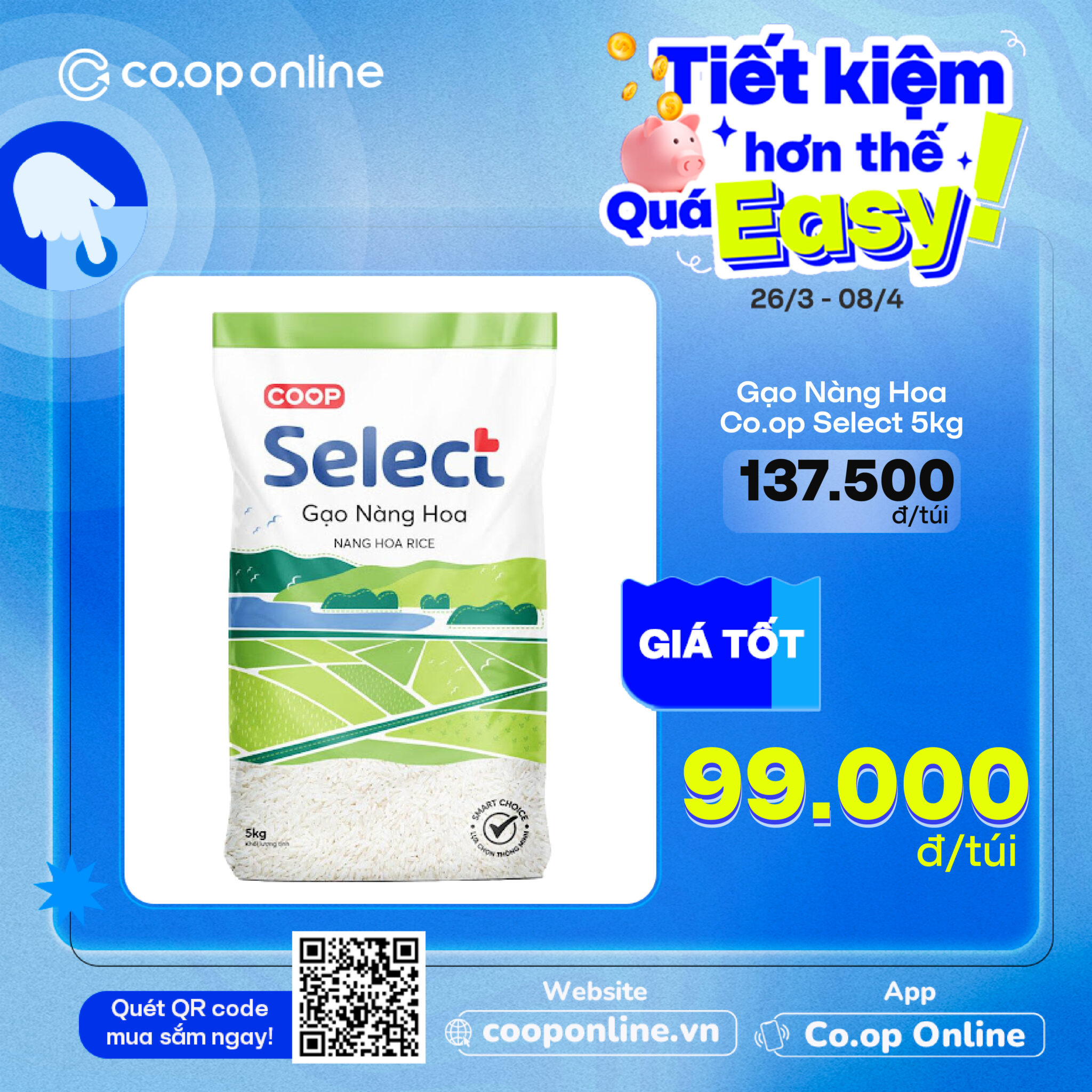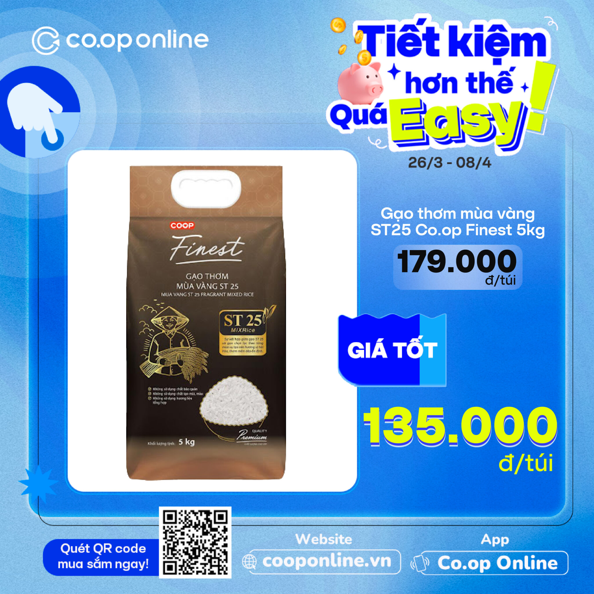 - Gạo thơm mùa vàng ST25 Co.op Finest 5kg: Cơm dẻo, thơm nức nhà, chuẩn vị, giá tốt chỉ 135,000đ/túi (giá thường 145.000đ/túi)