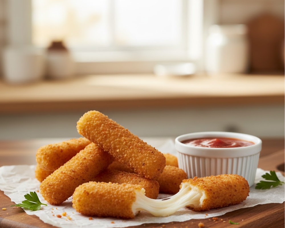 Món ăn được yêu thích, nhưng phiên bản món ăn vặt tại nhà này được tối giản hóa. Sử dụng phô mai que đã mua sẵn, nhúng qua bột chiên giòn và chiên nhanh trong dầu đã được làm nóng. Món này ngon nhất khi còn nóng, với lớp phô mai kéo sợi hấp dẫn.