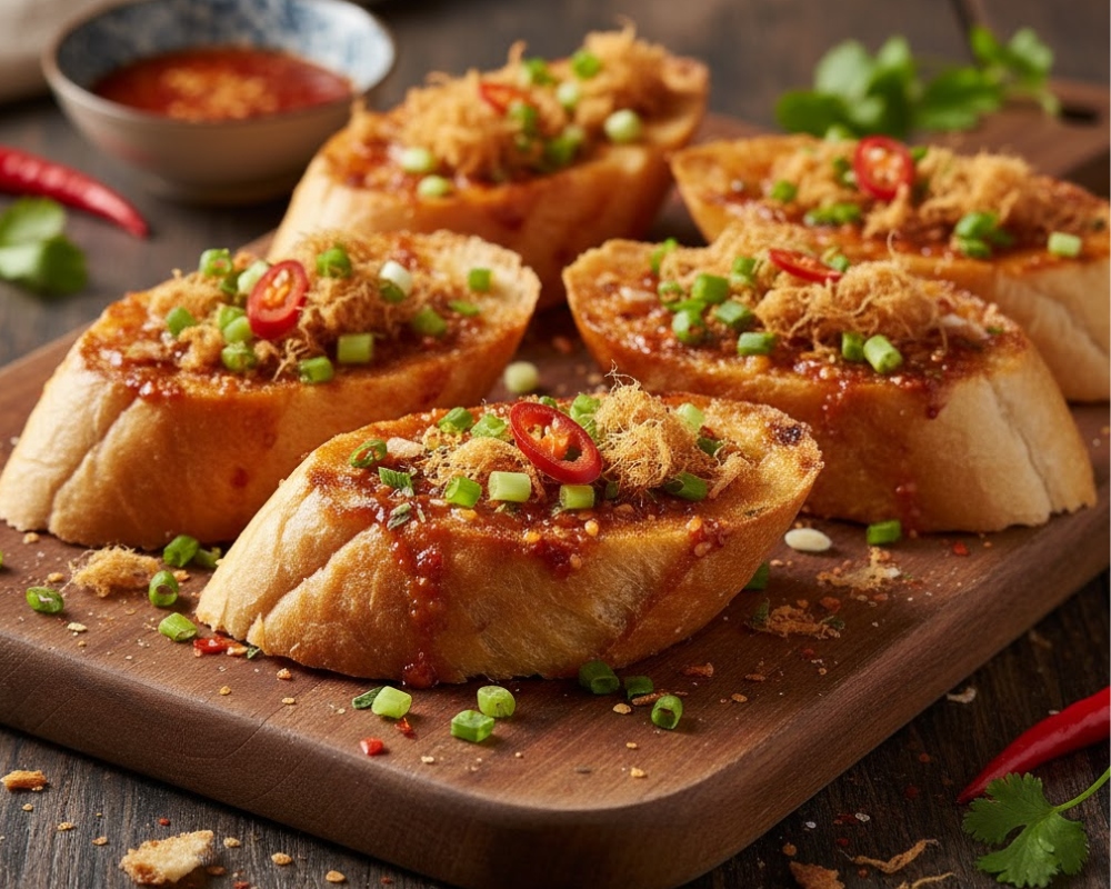 Chế biến: 2 muỗng canh muối ớt bán sẵn, 1 muỗng canh dầu ăn, 1/2 muỗng canh đường, một chút hành lá cắt nhỏ. Phết sốt lên bánh mì. Nướng 5 phút ở 160°C.