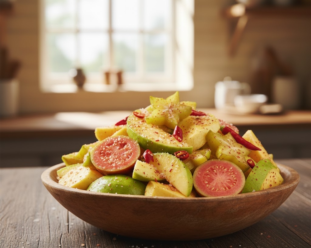 Chế biến: Cắt gọt và rửa sạch trái cây. Chuẩn bị hỗn hợp muối ớt tự chế (ví dụ: 1 phần muối, 1 phần đường, 1/2 phần ớt bột). Cho trái cây và hỗn hợp muối ớt vào hộp đựng có nắp kín. Đóng nắp và lắc mạnh 10-15 giây.