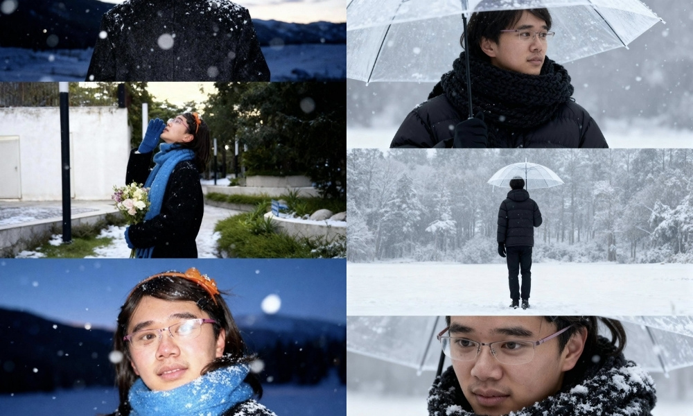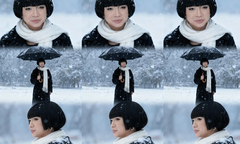 “Tạo một bộ ảnh điện ảnh ba khung hình dọc 4K, lấy khuôn mặt từ ảnh tham chiếu. Khung 1: Chân dung, nhân vật cầm ô trong suốt, nhìn thẳng. Biểu cảm buồn sâu lắng. Khung 2: Toàn thân, nhân vật đứng một mình giữa cánh đồng tuyết. Ngước nhìn bầu trời. Khung 3: Cận cảnh đôi mắt, thể hiện nỗi buồn lặng lẽ. Bối cảnh tuyết trắng xóa, tuyết rơi nhẹ, tông màu lạnh. Chất lượng siêu thực, ánh sáng mờ ảo.”